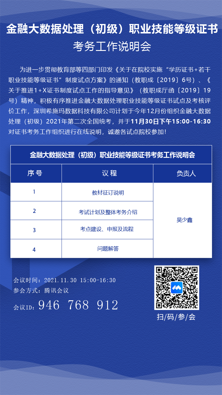 本次考试为金融大数据处理职业技能等级证书(初级)全国统一考试,采取无纸化考试形式,具体安排如下: